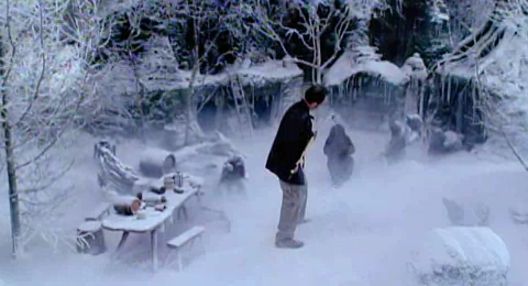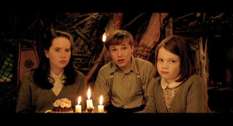 Standard closing credits, with voice over: “The Chronicles of Narnia: The Lion, the Witch, and the Wardrobe.”