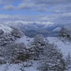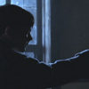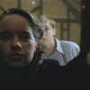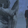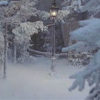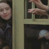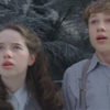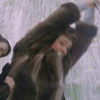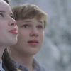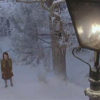 Susan pushing the coats aside, the wardrobe door open behind her with Peter visible. Snow starts to fall, covering the screen.