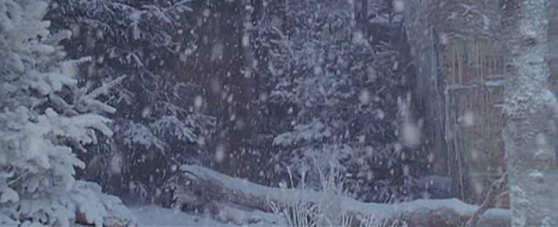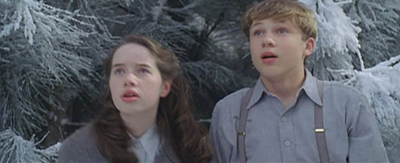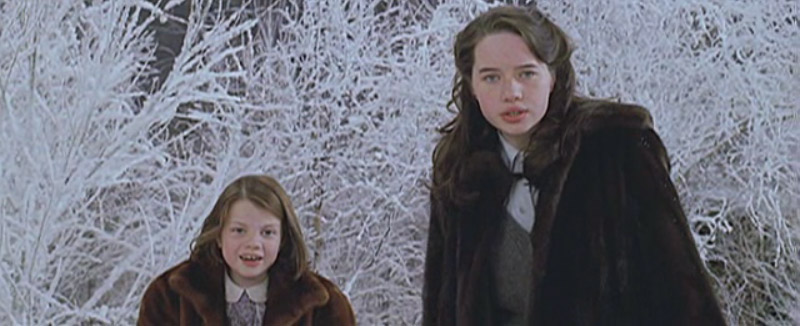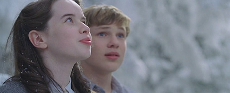 Susan pushing the coats aside, the wardrobe door open behind her with Peter visible. Snow starts to fall, covering the screen.