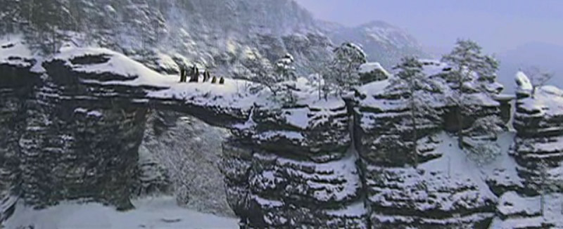 Shot of children and beavers walking over natural stone bridge (same as trailer 1)