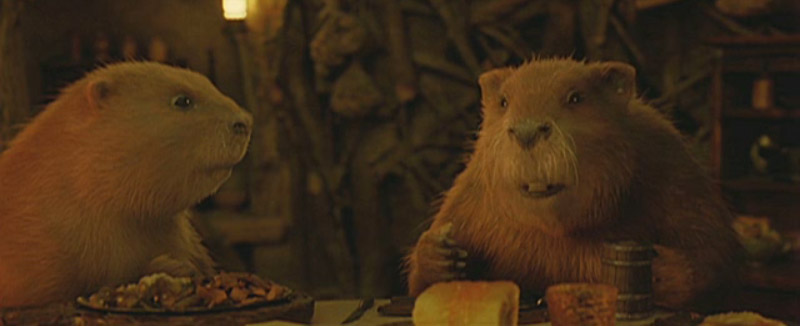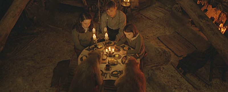 Shot of Susan, Peter, and Lucy at beavers’ table.