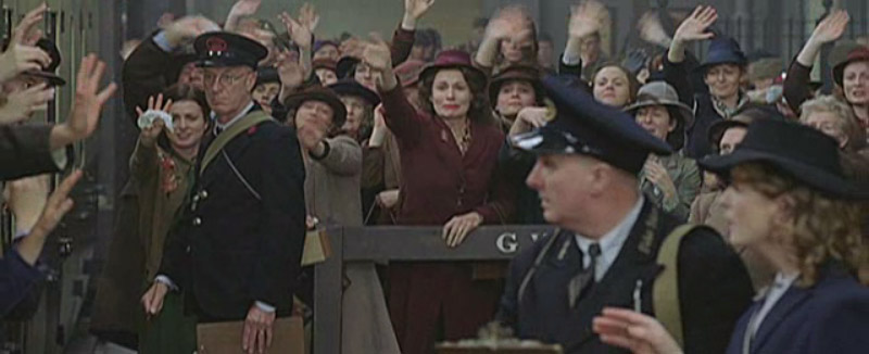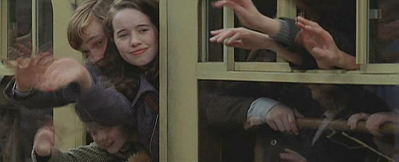 Children wave from train windows.