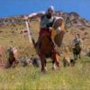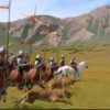Armored faun warriors, seeming to have waited impatiently for the battle to begin, now launch forward with the beginning battle cries. The music is a sad-sounding choir, like unto the music from some of our Lord of the Rings sequences, where victory does not seem possible, yet the will and resolve of the free peoples of Narnia is to fight, regardless of the outcome. Centaurs and leopards gallop past us, down a hill.