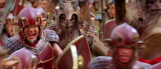 The music takes on a military tone. This charge is glorious, but down to business. Fauns with spears and battle banners rush past us.