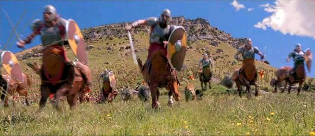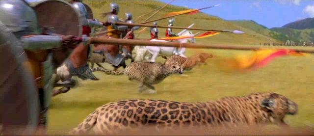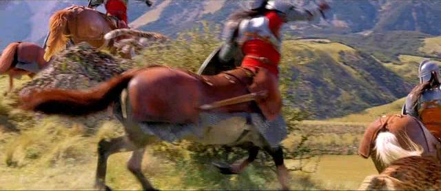 Armored faun warriors, seeming to have waited impatiently for the battle to begin, now launch forward with the beginning battle cries. The music is a sad-sounding choir, like unto the music from some of our Lord of the Rings sequences, where victory does not seem possible, yet the will and resolve of the free peoples of Narnia is to fight, regardless of the outcome. Centaurs and leopards gallop past us, down a hill.
