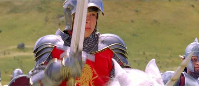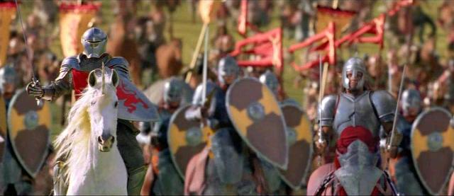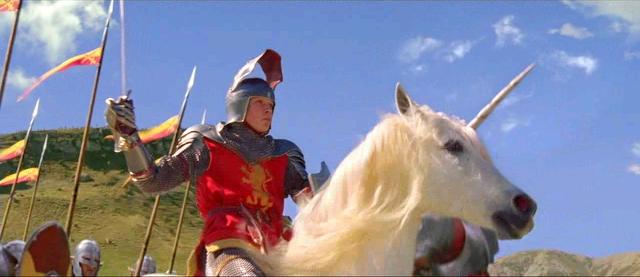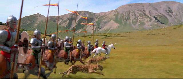 Shot of Peter, nobly astride his unicorn, leading the charge beside his general.