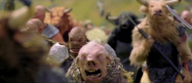 Shot of opposing army; ogres and Cyclops plunging forward. Otmin is rushing forward, outpacing his other soldiers, grunting again as he runs.