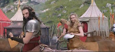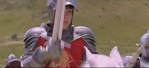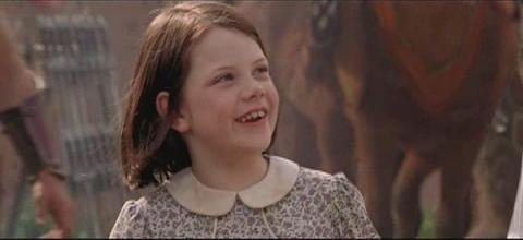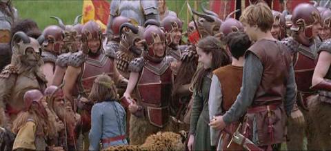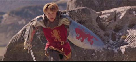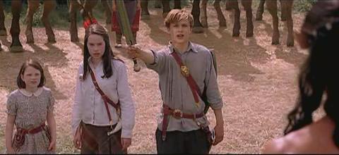 (Clips: Peter looks at a griffin (I think) flying before the battle, Peter points his sword to the ground in preparation to be knighted; Aslan knights Peter with his paw; the four Pevensies look at each other outside of Tumnus house; the children overlook Narnia; a shot of the White Witch; Tumnus and Lucy running through the forest; the army running, and Edmund directing the air attack on the WW’s army.)