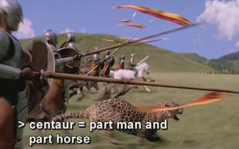 (Centaurs lowering spears, Peter draws out his sword; Centaurs drawing out swords, army cheering.)