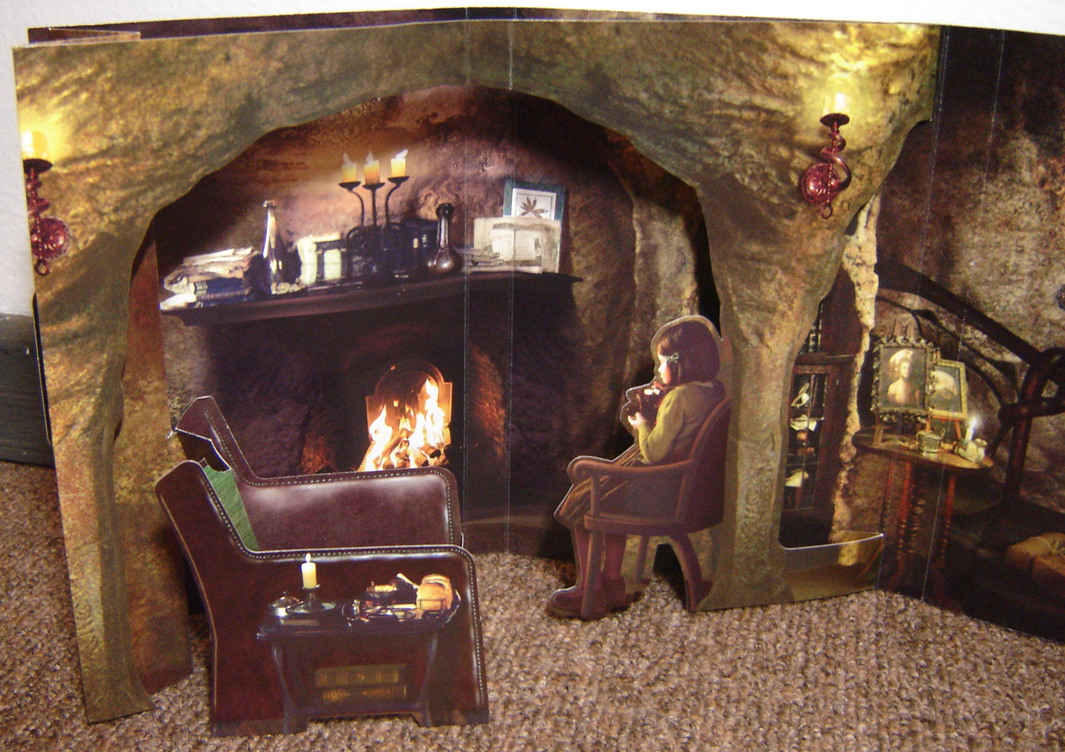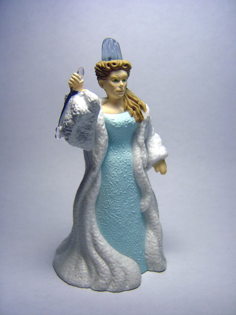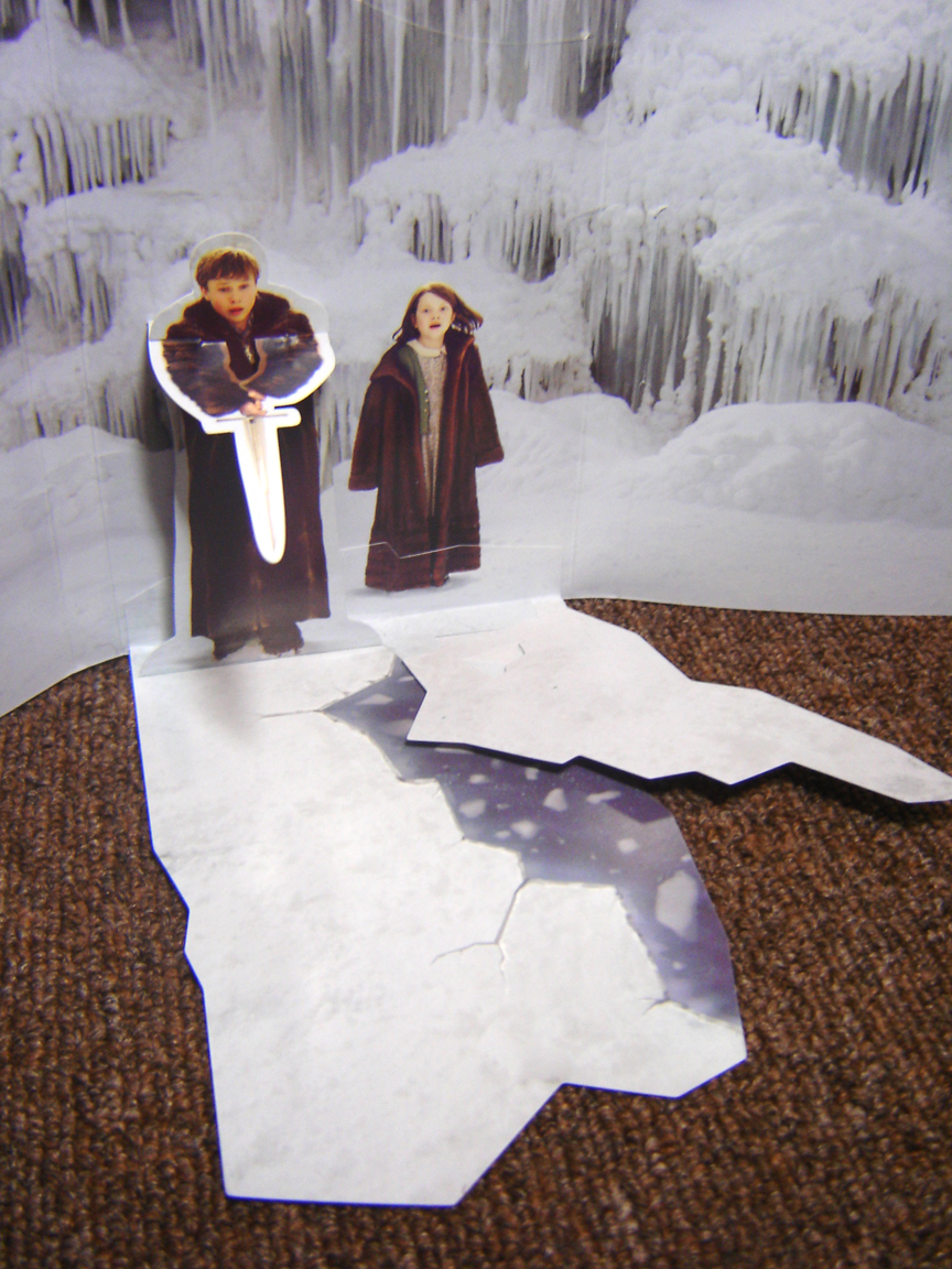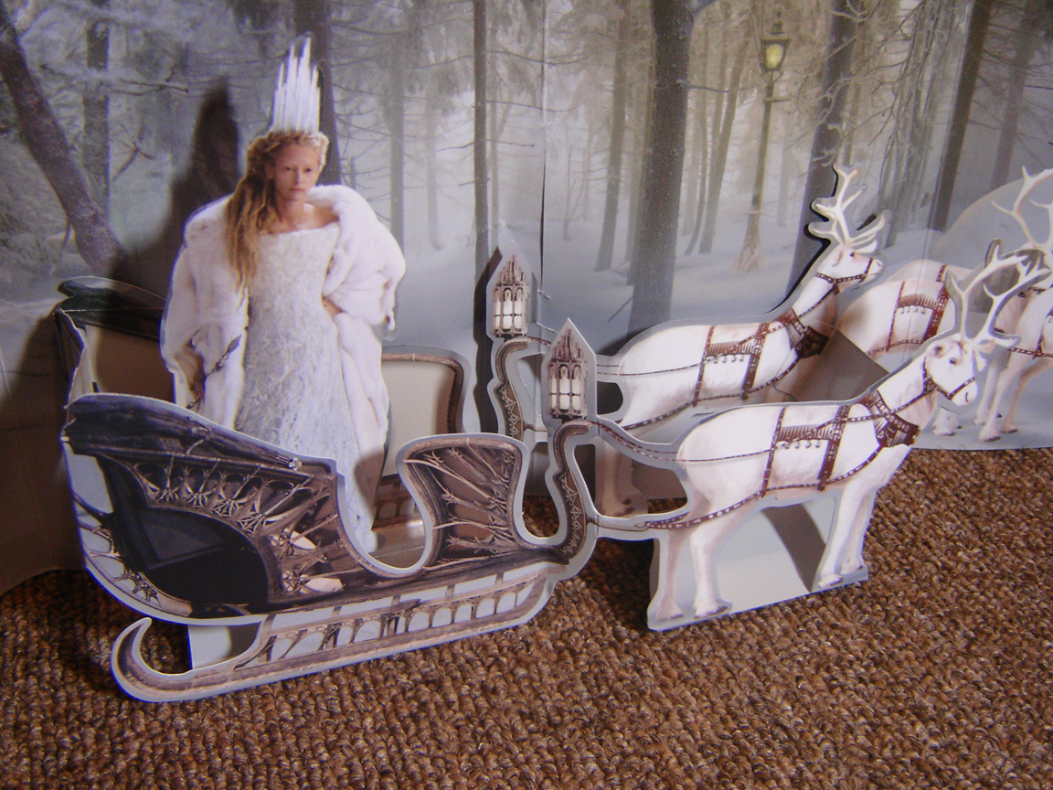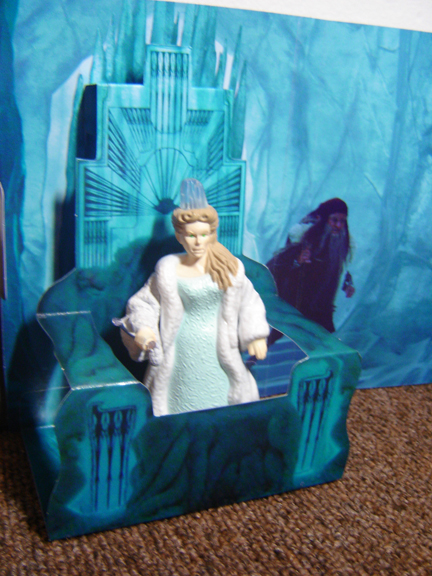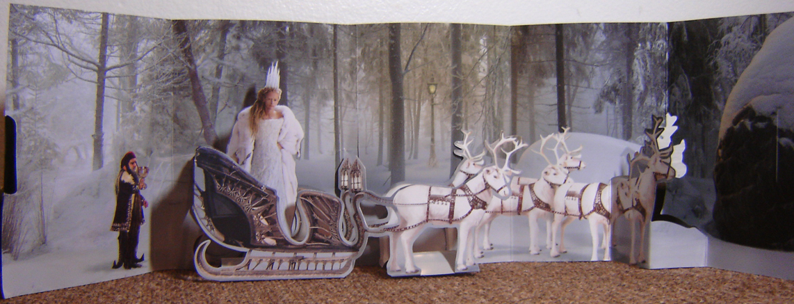 The White Witch and her Castle features The White Witch, Jadis, who raises her wand as if to cast a spell when the lever in her back is pushed, and an elaborate diorama of her castle and dungeon. Susan Pevensie and the Wolves includes a picturesque winter scene diorama with pop-up wolves and Peter with his sword.