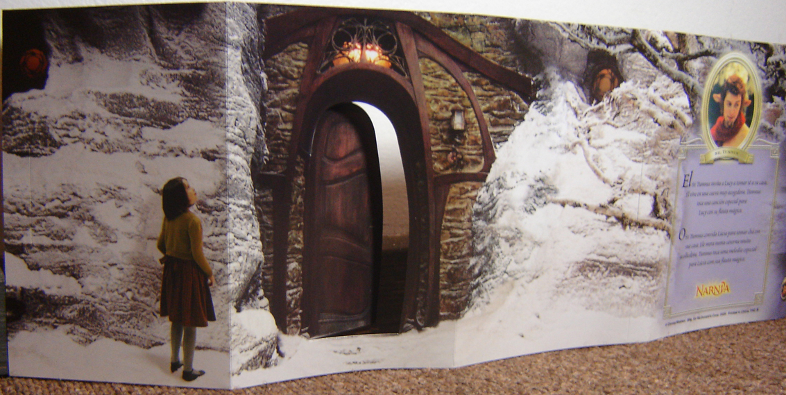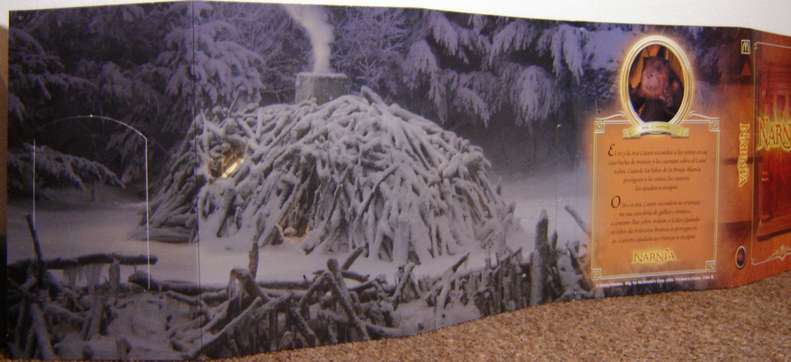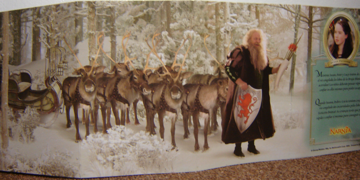 Each McDonald’s Happy Meal featuring The Chronicles of Narnia includes an articulated action figure and interactive pop-up book that provides a richly detailed play environment to bring the film to life. Lucy Pevensie and the Wardrobe features a charming Lucy action figure. The door of Lucy’s wardrobe diorama opens so she can enter the mystical world of Narnia on the reverse side. Mr. Tumnus and his Home includes Tumnus, who sports a scarf that doubles as a whistle, and a detailed pop-up book depicting his wintry home. Edmund Pevensie and the White Witch features Edmund and a pop-up sleigh with a 3-D White Witch inside, led by four reindeer. The Mr. Beaver and his Home diorama depicts Mr. Beaver’s abode with pop up furniture – press Mr. Beaver’s tail and he flaps it up and down.