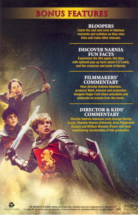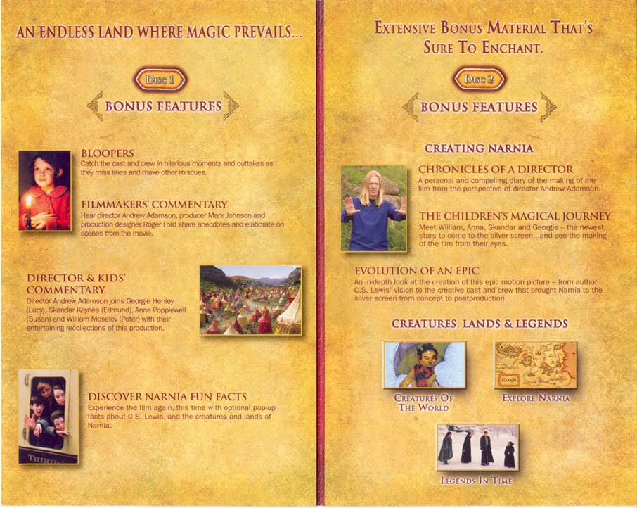 NarniaWebber ‘Griffle’ has posted images of the cover art and inserts from the Single-disc and 2-disc editions of the Narnia DVD.