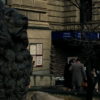 SUSAN AND LUCY RUN ACROSS THE ROAD CARRYING BAGGAGE IN THEIR HANDS INTO AN UNDERGROUND STATION. A DOUBLE DECKER BUS CAN BE SEEN IN THE BACKGROUND.