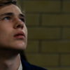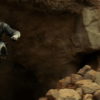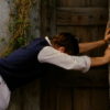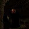 SHOT OF PETER PUSHING ASIDE A STONE COVER REVEALING THE WOODEN DOOR BEHIND IT.