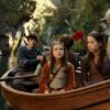 SHOT OF THE CHILDREN AND TRUMPKIN IN A BOAT. SHOT OF CASPIAN SURROUNDED BY OLD NARNIANS.