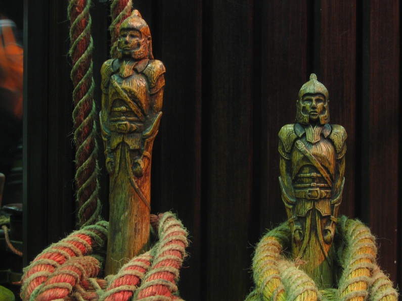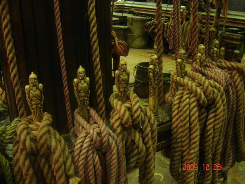 - Rigging tied onto carved statues