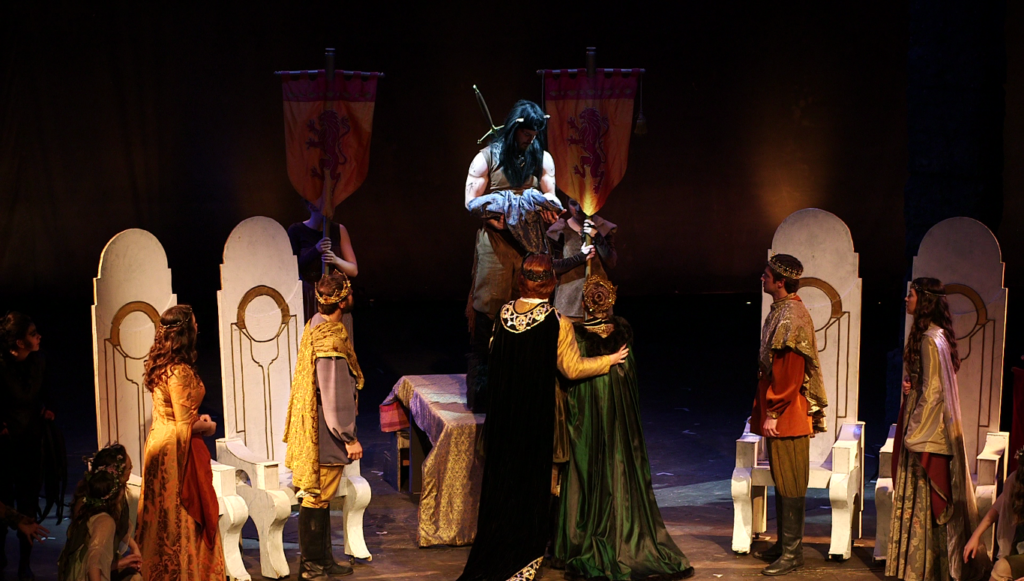 A recurring theme in the book is storytelling, and during an interview after the show Nicole Stratton said she wanted to use that in her version. As characters tell stories of what happened to them previously, the set pieces move around them and the audience is shown both the story as it is happening and the other characters the story is being told to. In some cases, this works very well. Aravis’ (Hope Barr) backstory was particularly poignant as she moved back and forth from interacting with Bree (voiced by Micah Hamilton), Hwin (voiced by Sheri Chavers), and Shasta, and interacting with other characters. This format was executed well during the emotionally fraught moments, such as Aravis’ attempted suicide. It was also used well for comedic effect when she describes her suitor, the Vizier Ahoshta (Eli Ramsour), to Bree and Shasta, and then the scene immediately cuts to Aravis’ father (Craig Stouffer) reacting to her saying the exact same thing at a party.