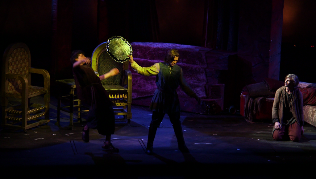 One of the best uses of the storytelling format was when Corin (Ethan Gueck) explained to Shasta where he had been. Corin knocked down and was knocked down by Calormenes all over the stage even though the set pieces never changed from the Narnians’ suite in Tashbaan. They even used props from around the room as part of the action. The audience laughed loudly throughout the entire sequence.