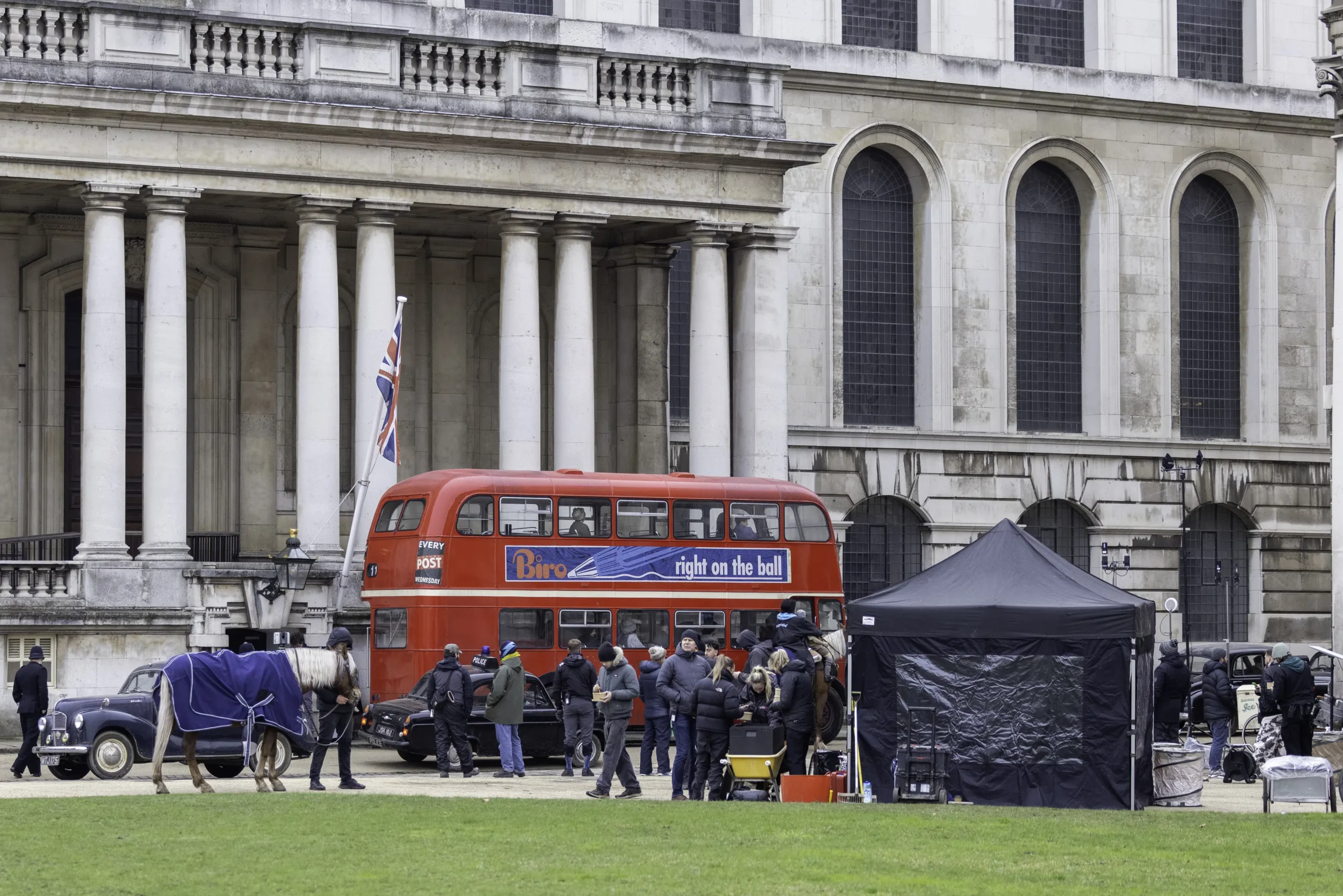 What’s on Netflix shared new photos and videos taken this past weekend at the Old Royal Naval College in Greenwich, confirming that this is the same large-scale chase sequence previously filmed across Manchester, London, and Bradford in August and September. Production has now returned to the sequence, picking it back up in a new location as filming continues into the new year.